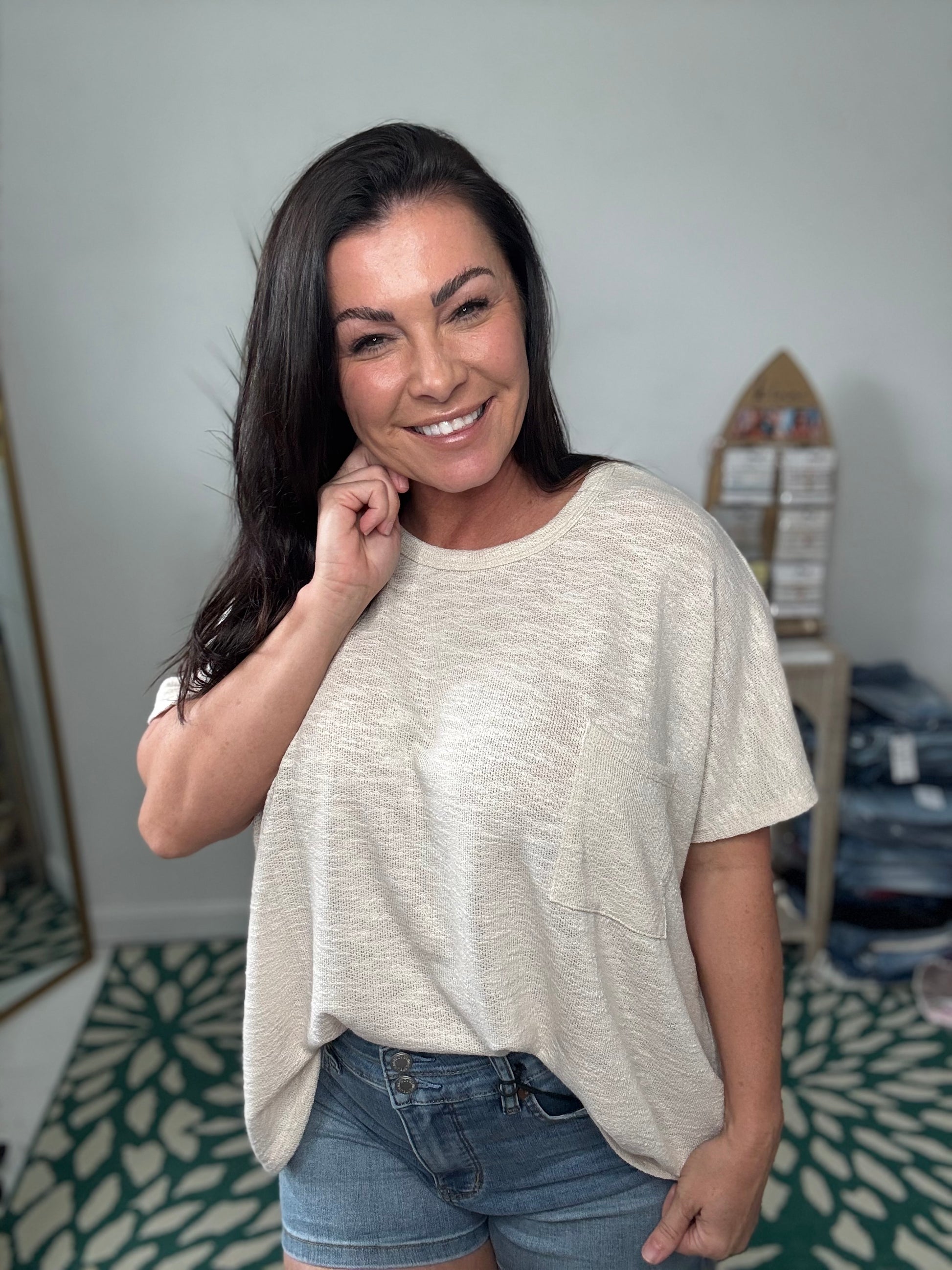 The delicious add on to any basic b's wardrobe. Perfect for the warmer weather. Soft hacci knit fabric with an oversized fit pairs great with trendy straight leg jeans or the shorts.