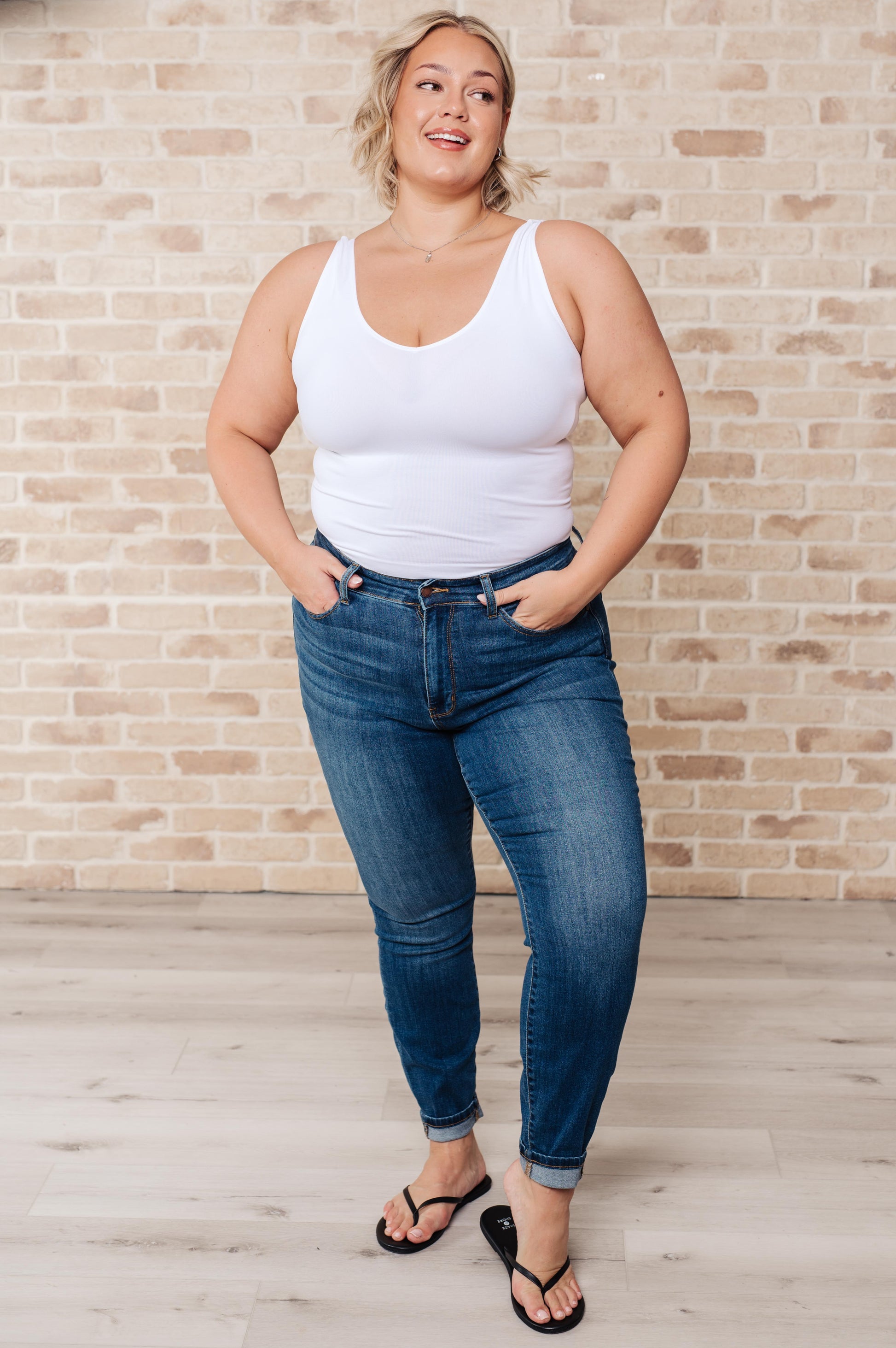 Introducing the High Rise Skinny Jeans - the perfect blend of style and comfort. With a flattering high rise fit and classic dark wash, these non-distressed jeans are a versatile addition to your wardrobe. Plus, the 4-way stretch ensures a comfortable fit all day long. Don't miss out on these timeless skinny jeans! (No more awkward waist gaps!)