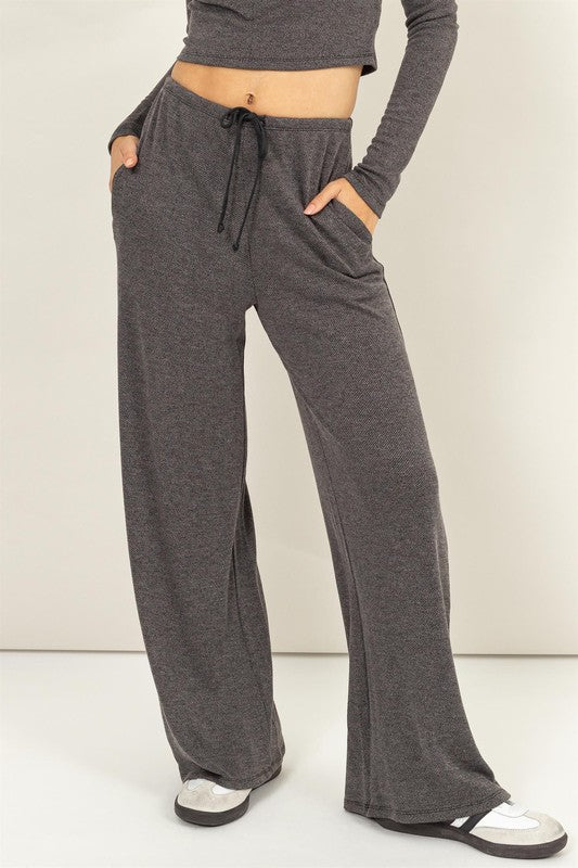 Step up your loungewear game with these black drawstring high-waisted knit pants. Made from a soft, stretchy fabric, these pants offer a relaxed fit while still looking stylish. The drawstring waist allows for a customizable fit and the wide-leg silhouette adds a touch of trendiness. Perfect for casual wear or chilling at home.