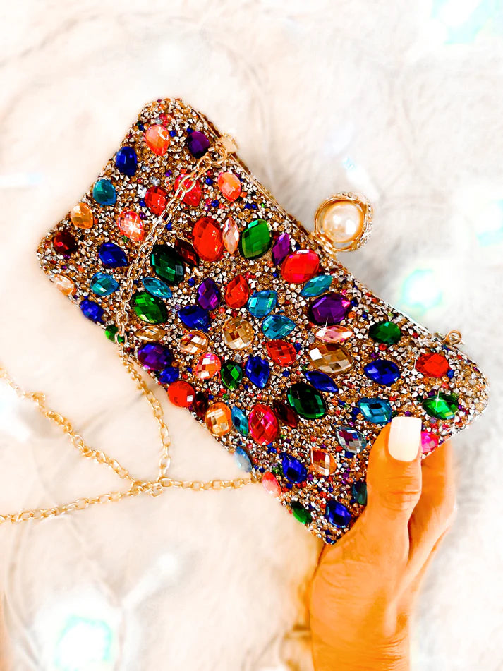 Expertly hand-crafted and adorned with allover jewel rhinestones, our Gold Showstopper Clutch is a stunning addition to any outfit. The removable chain strap adds versatility, while the snap closure keeps your essentials secure. Please note, due to its handmade nature, rhinestone colors and placements may vary.