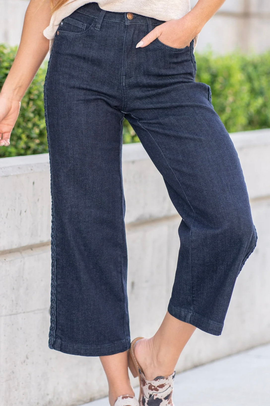 The High Rise side seam braid detail crop wide leg jeans offer a contemporary twist on classic denim. Featuring a unique braided detail along the side seams, these jeans add a stylish flair to your outfit. The cropped length and wide-leg silhouette create a relaxed fit that’s both comfortable and chic. Made from soft, breathable fabric, they are perfect for warmer days or layering in cooler weather. Pair them with a fitted top or a casual blouse for a trendy look that stands out. Elevate your style with these distinctive wide-leg jeans!