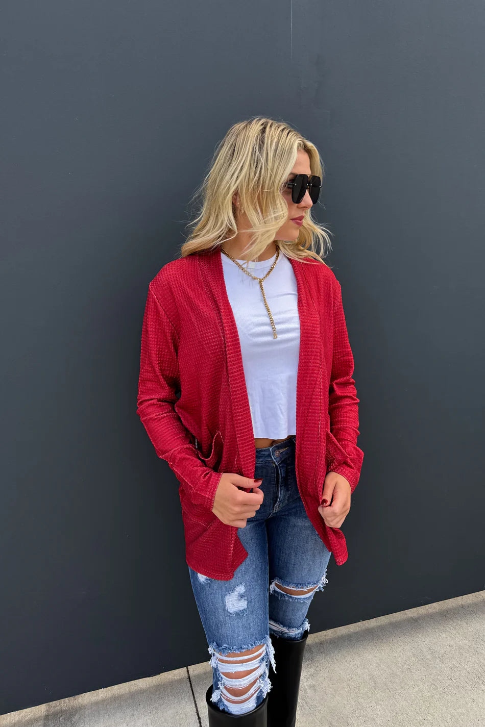 One of our most popular oversized pocket cardigans! Now comes in a perfectly adorable bubble/waffle knit fabric. Not the typical "waffle" fabric! This is a thicker stretchy knit fabric! Amazing! Breezy and lightweight and features thumbhole cuffs.