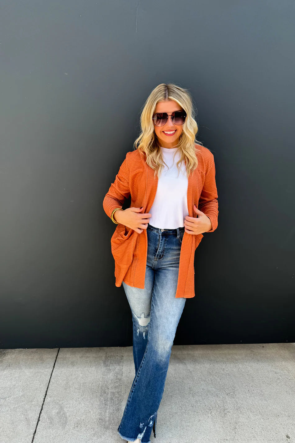 One of our most popular oversized pocket cardigans! Now comes in a perfectly adorable bubble/waffle knit fabric. Not the typical "waffle" fabric! This is a thicker stretchy knit fabric! Amazing! Breezy and lightweight and features thumbhole cuffs.