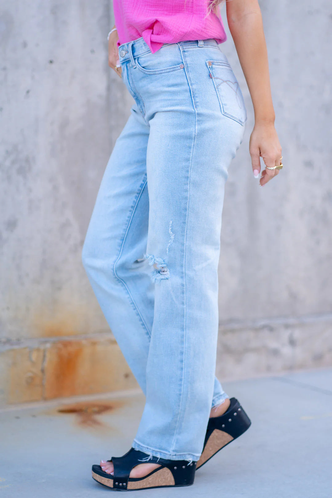 Rock the hottest trend with Straight Jeans! Featuring a light wash and distressed front and back, these jeans offer a unique and stylish look. Their high rise and 90's straight silhouette provide a flattering fit for any body type. Upgrade your wardrobe with these must-have jeans!