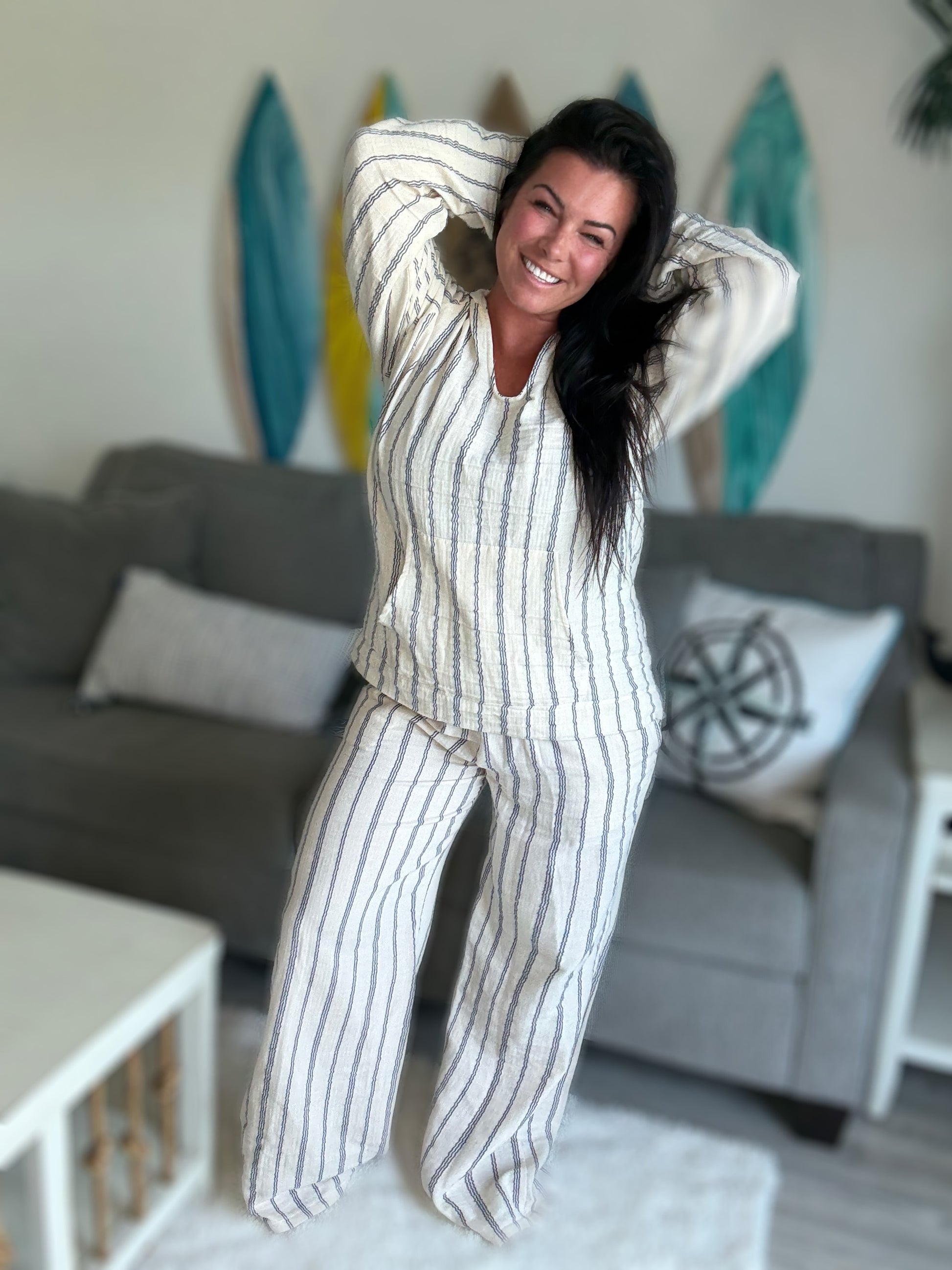 Crafted from high-quality 100% cotton, our Cabana Pants offer a relaxed fit and a comfortable feel for all-day wear, no matter the occasion. The wide-leg silhouette adds a touch of sophistication to your ensemble, while maintaining a relaxed and effortless look. These cozy favorites are perfect for celebrating the refreshing energy of spring. Whether you're relaxing at home, enjoying an Easter celebration, or exploring the outdoors, these pants offer the ideal blend of comfort and style.