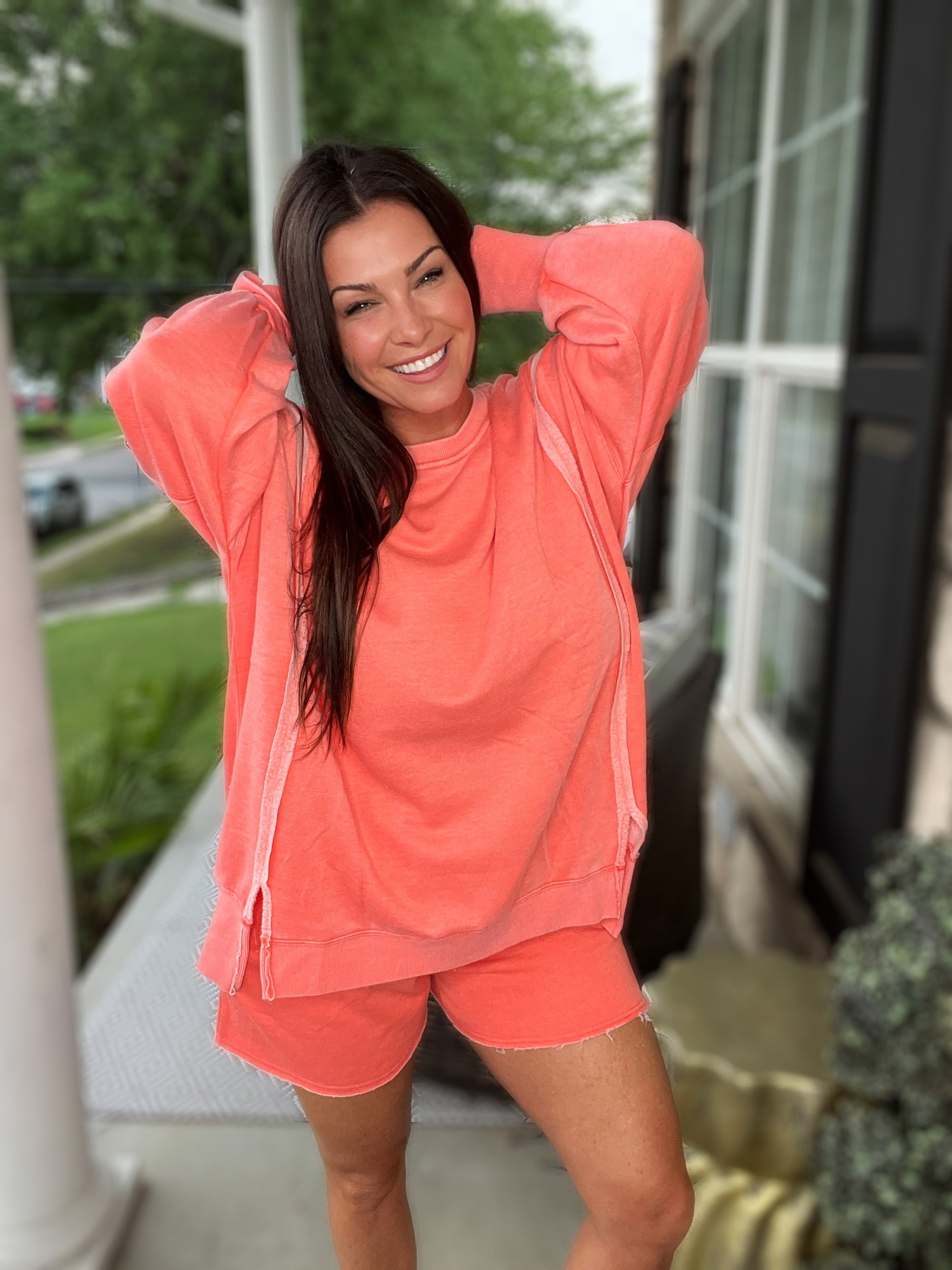 We spared no attention to detail in our sweatshirt! This forever timeless pullover is a slouchy, relaxed fit with exposed seaming, cute split cuff hem and ribbed trim detail! Has super soft "sweatshirt" feel on the inside!