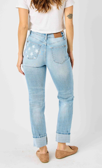 Introducing The Freedom- Mid Rise Judy Blue Boyfriend jeans. These jeans feature a comfortable mid rise fit and playful stars on the back pockets. Enjoy both style and comfort with this trendy and versatile addition to your wardrobe.