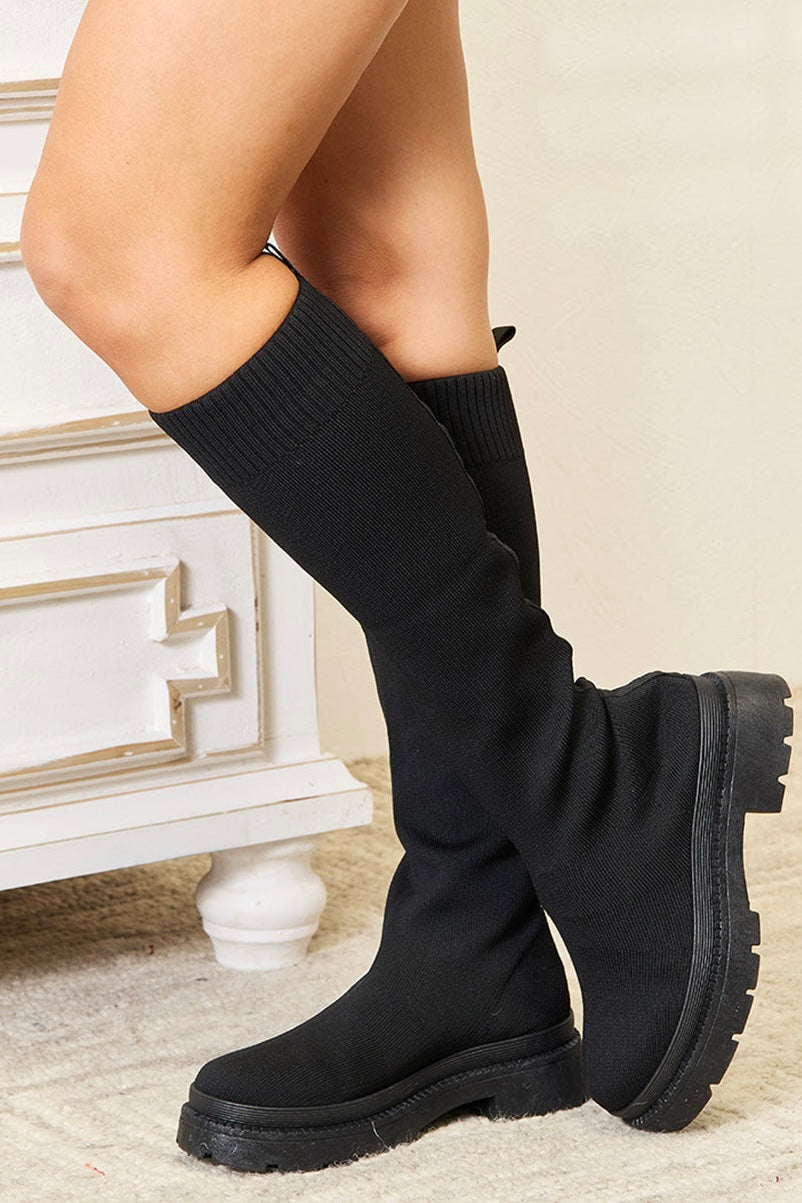 Elevate your style game with these sleek and versatile boots that reach just below the knee, adding a touch of chic sophistication to any outfit. Crafted with premium materials, these boots feature a snug sock-like fit that hugs your legs comfortably while providing excellent support with a stylish platform sole.